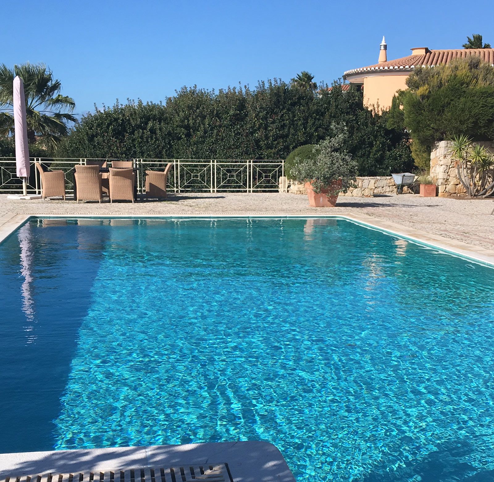 Der 6 x 12 Meter große Pool ist in die mit Calsada verlegte Terrassenfläche integriert. Der Einstieg in den Pool erfolgt über eine großzügige Stufenanlage und fällt von ca. 1,20 m kontinuierlich auf ca. 2,20 m ab.