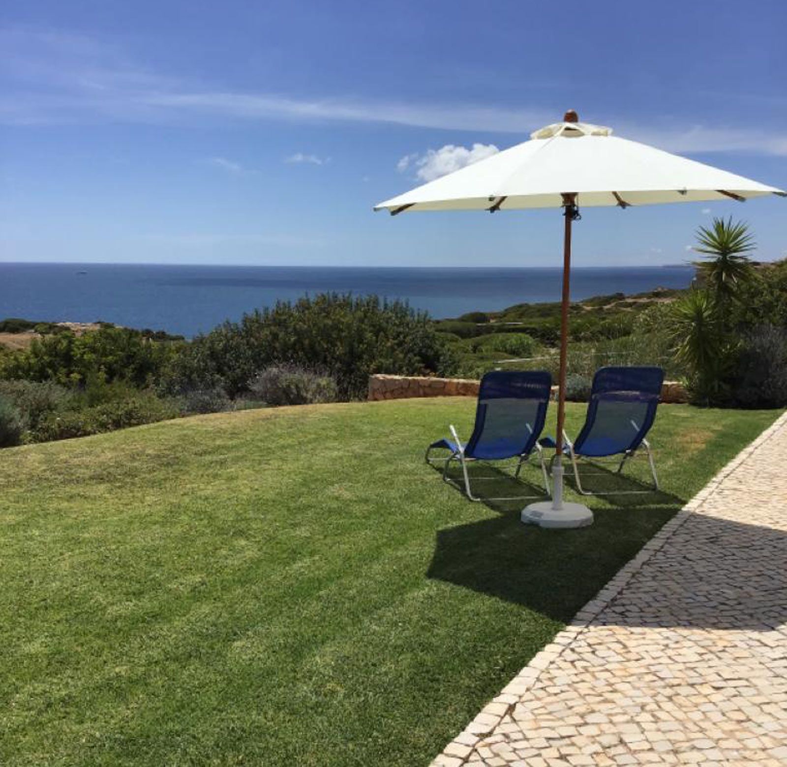 Der direkte Meerblick geht über einen großen Pool und den ca. 3000 m2 großen Naturgarten auf die Weite des Meeres.