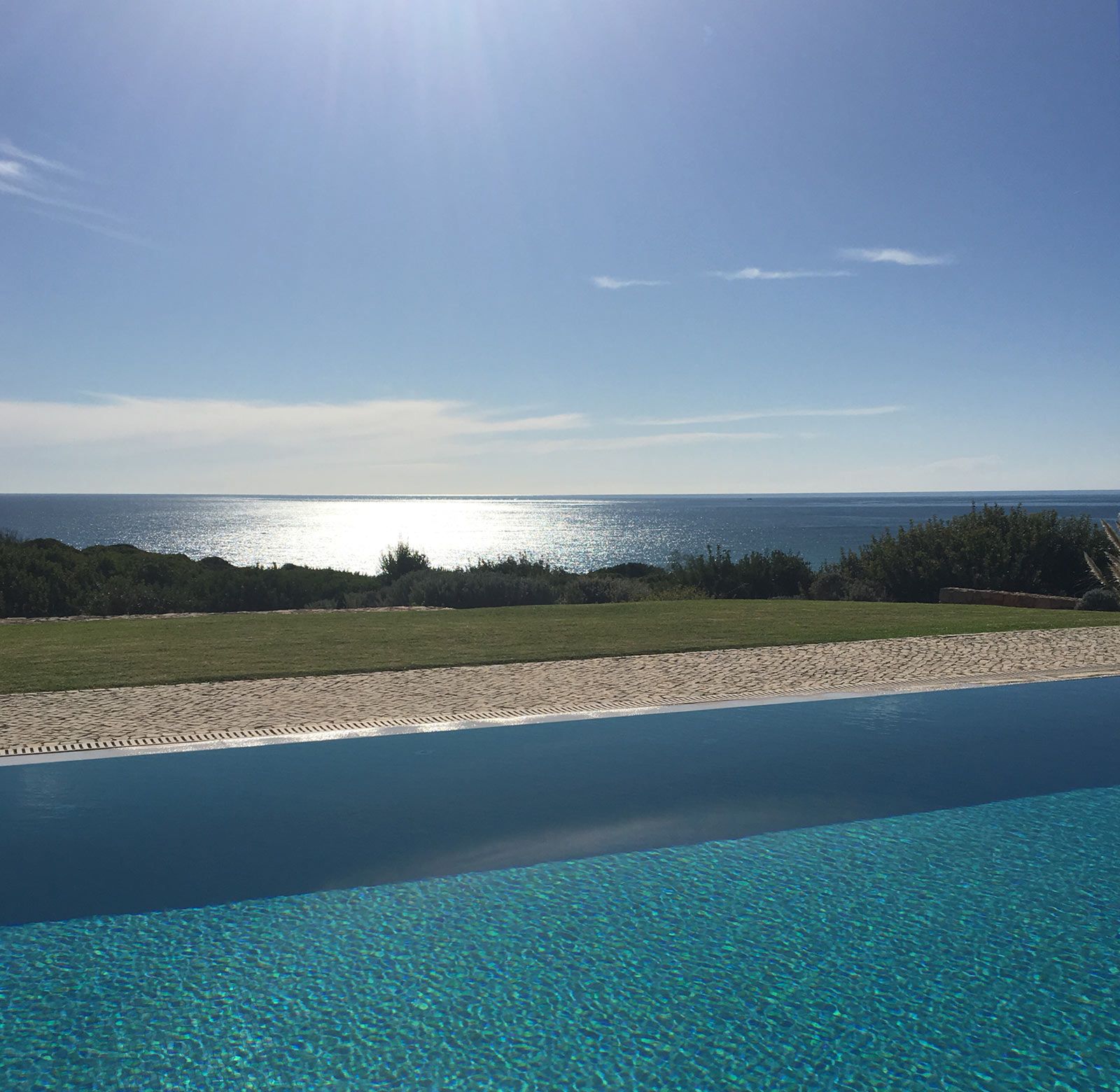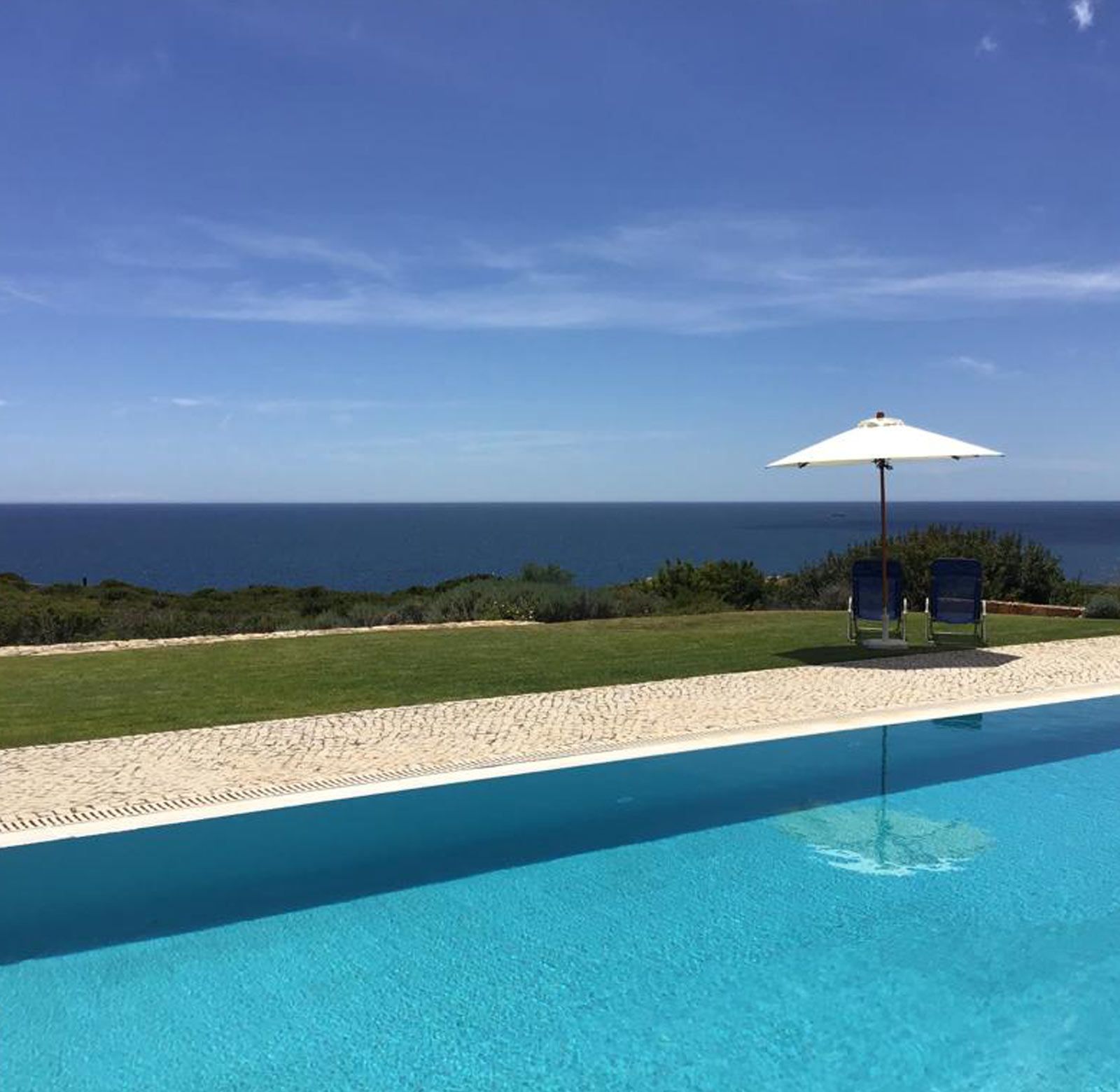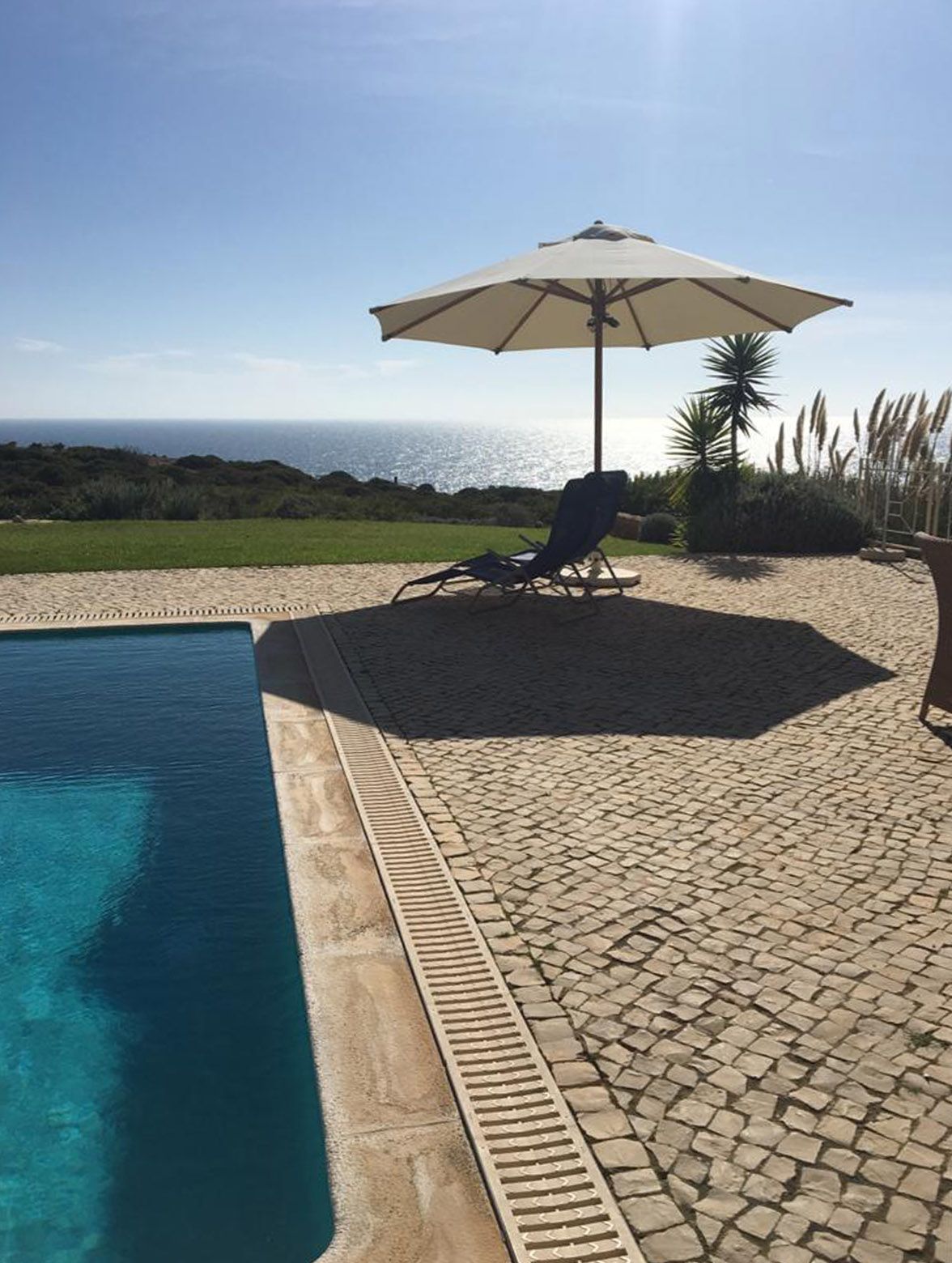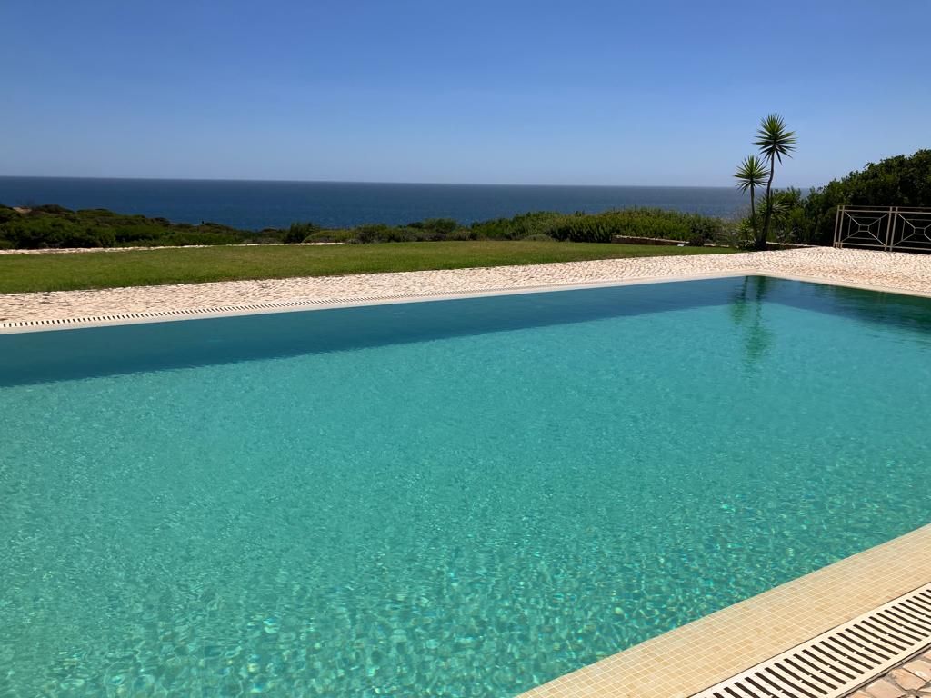 Der direkte Meerblick geht über einen großen Pool und den ca. 3000 m2 großen Naturgarten auf die Weite des Meeres.