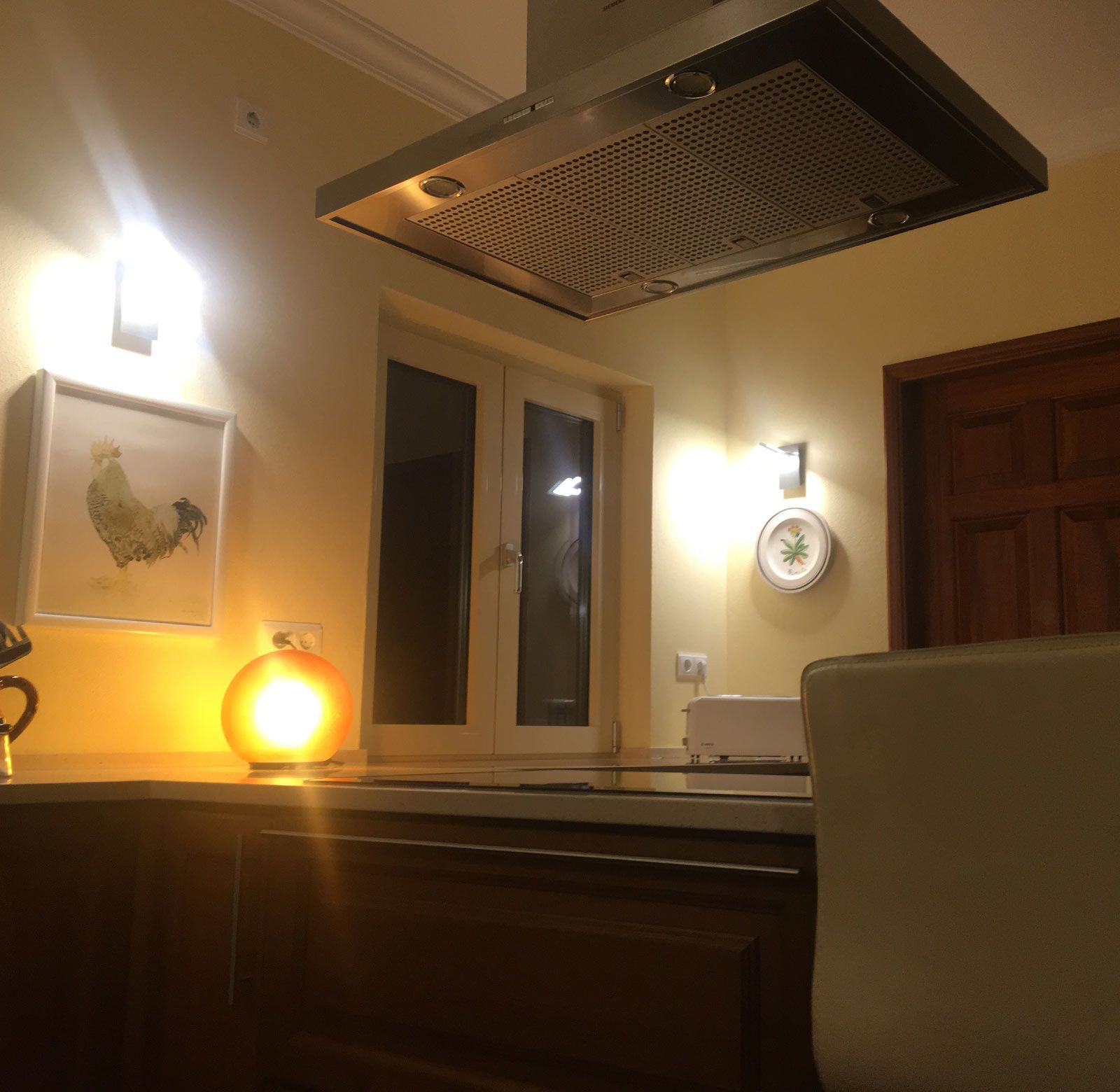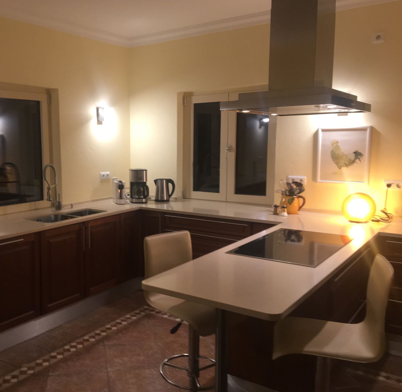 Die sich im Erdgeschoss befindende große Küche begeistert mit einem traumhaften Ausblick direkt auf den Atlantik. Bei der Planung des Hauses im Jahr 1999 wurde ausgesprochener Wert auf diesen Ausblick gelegt. Die Küche ist sehr geräumig und bietet reichlich Arbeitsflächen und Lagermöglichkeiten. Ausgestattet ist sie mit Induktionsherd, Mikrowelle, Backofen, großem Kühlschrank, Geschirrspüler, Doppelwaschbecken sowie vielen nützlichen Elektrogeräten und weiteren nützlichen Utensilien.