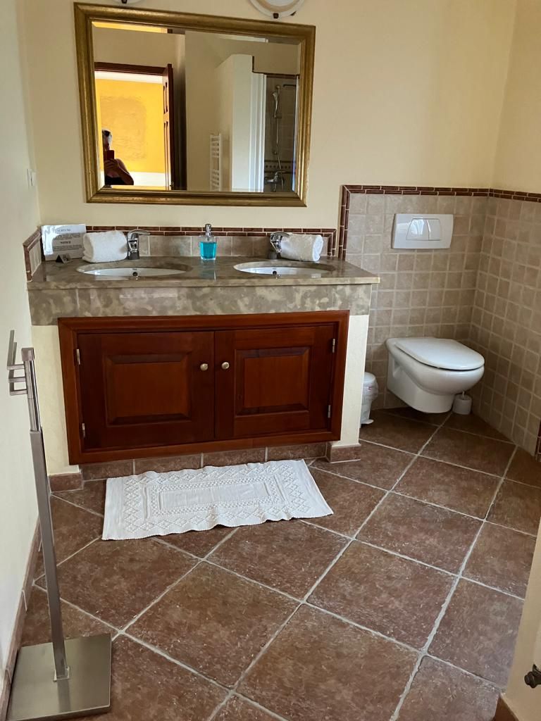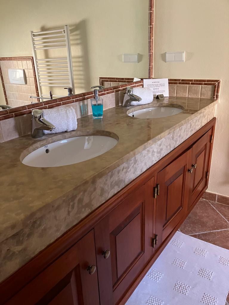 Im Erdgeschoss befinden sich zwei Appartements mit je einem Doppelbett, einem eigenen Badezimmer mit Doppelwaschbecken und Dusche.